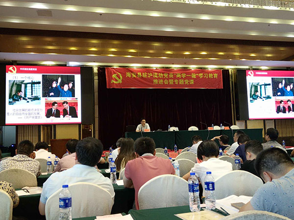 同時,根據(jù)縣委組織部對“兩學一做”教育活動的工作安排,“聯(lián)合黨委”于5月19日下午舉行“兩學一做”教育活動專題黨課。“聯(lián)合黨委”書記李忠澤作“兩學一做”動員報告,海安縣委黨校常務副校長徐進、副校長程衛(wèi)國分別作“學習黨章、學習系列講話”專題黨課,海安籍在滬流動黨員近400人參加活動。