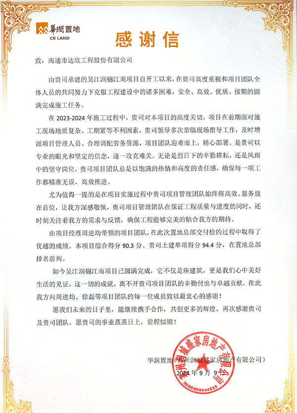 近日,公司收到華潤置地發(fā)來的感謝信,信中對集團第一工程公司承建的吳江潤樾江南項目在施工過程中攻堅克難,嚴(yán)把安全生產(chǎn)關(guān),促進項目履約,為華潤置地高質(zhì)量發(fā)展作出的貢獻表示感謝。
