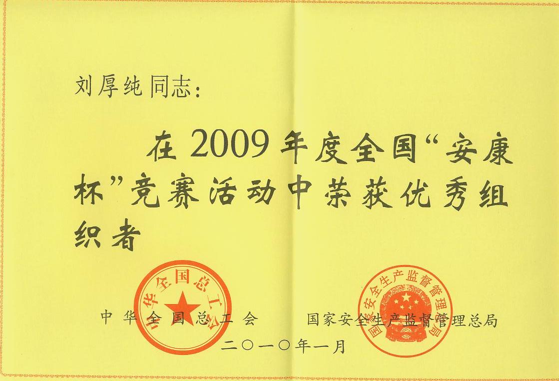 中華全國總工會、國家安全生產(chǎn)監(jiān)督管理總局聯(lián)合發(fā)文,公司黨委書記、副董事長劉厚純獲得2009年度全國“安康杯”競賽活動優(yōu)秀組織者稱號。