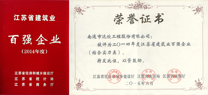 為充分發(fā)揮優(yōu)勢企業(yè)在全行業(yè)中的引領和示范作用,打造建筑企業(yè)品牌,提升核心競爭力,省住房城鄉(xiāng)建設廳、統(tǒng)計局、商務廳成立了“百強企業(yè)”認定委員會,本著“尊重事實、嚴格標準、規(guī)范程序、公平公正”的原則,組織開展了2014年度建筑業(yè)“百強企業(yè)”(企業(yè)包括總承包綜合實力類、建筑裝飾裝修類、建筑鋼結構類、建筑安裝類、基礎設施類等)認定工作。經評議,公司首度榮登2014年江蘇省建筑業(yè)“百強企業(yè)”。按照《江蘇省建筑業(yè)企業(yè)信用綜合評價辦法》(蘇建建管〔2013〕602號)文件精神,自發(fā)布之日起的一年內,“百強企業(yè)”可在施工企業(yè)信用考評中做為省級獎項予以加分。