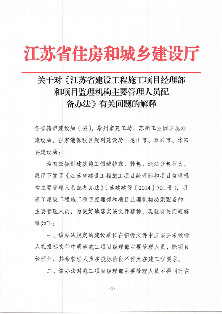 關(guān)于對《江蘇省建設(shè)工程施工項(xiàng)目經(jīng)理部和項(xiàng)目監(jiān)理機(jī)構(gòu)主要管理人員配備辦法》有關(guān)問題的解釋
