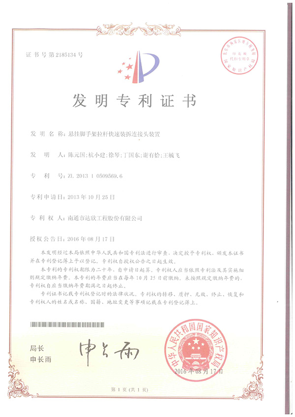 由第一工程公司申報(bào)的《懸掛腳手架拉桿快速裝拆連接頭裝置》成功獲國家知識產(chǎn)權(quán)局授權(quán),于2016年8月17日獲得國家發(fā)明專利證書。該發(fā)明專利系工程公司《無攬風(fēng)繩獨(dú)立桅桿吊裝勁性鋼柱專用夾具》后又一國家發(fā)明專利。