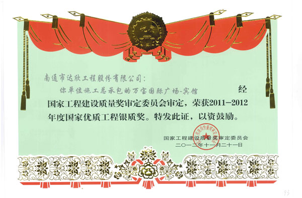 我公司總承包施工的上海“萬寶國際廣場-賓館”作為主申報單位,在先后獲得上海市“節(jié)約型”樣板工地、上海市優(yōu)質(zhì)結(jié)構(gòu)工程、上海市“白玉蘭”優(yōu)質(zhì)工程后,經(jīng)上海市建筑施工行業(yè)協(xié)會推薦,經(jīng)國優(yōu)專家組現(xiàn)場檢查,評審委員會評審,最終榮獲了2011-2012年度國家優(yōu)質(zhì)工程銀質(zhì)獎。上海萬寶國際廣場-賓館項目是自公司易名以來,首次以“達欣股份”為主體的總承包申報項目。