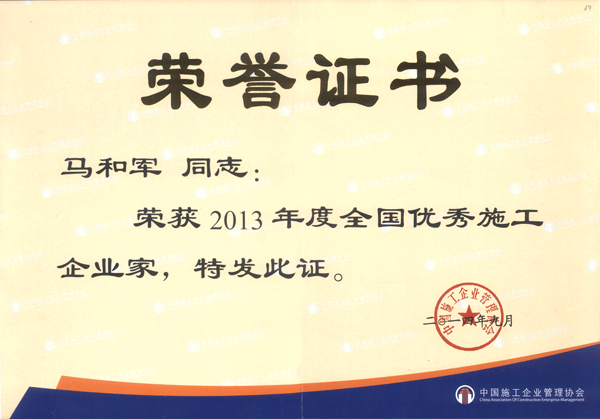 中國施工企業(yè)管理協(xié)會于今年2月發(fā)出召開“2014年全國施工企業(yè)領(lǐng)軍人物峰會”的通知,根據(jù)通知要求,嚴(yán)格按照“全國優(yōu)秀施工企業(yè)家”條件在全國范圍內(nèi)優(yōu)選參會代表。經(jīng)申請、推薦、審核、公示,中國施工企業(yè)管理協(xié)會企業(yè)家工作委員會審定,確定166位企業(yè)領(lǐng)導(dǎo)為“2014年全國施工企業(yè)領(lǐng)軍人物峰會”參會人選并授予“全國優(yōu)秀施工企業(yè)家”榮譽稱號。公司董事長馬和軍榮列榜單之中。
