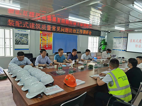 吳慧強從項目概況、前期準備、常見問題和防治、現(xiàn)場不足五方面向領(lǐng)導(dǎo)們作了匯報。他表示,項目部將結(jié)合工程實際經(jīng)驗,積極為裝配式產(chǎn)業(yè)發(fā)展建言獻策。