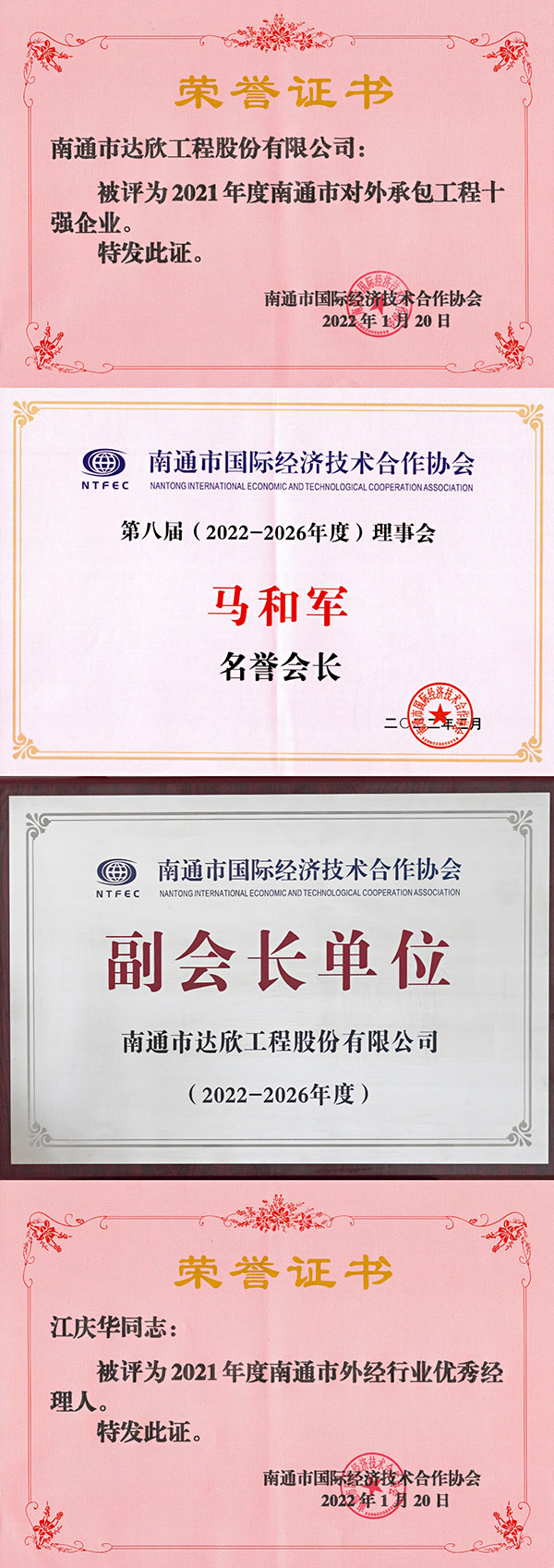 會(huì)上,達(dá)欣集團(tuán)被評(píng)為2021年度南通市對(duì)外承包工程十強(qiáng)企業(yè),董事長馬和軍當(dāng)選第八屆(2022-2026年度)理事會(huì)名譽(yù)會(huì)長,企業(yè)當(dāng)選為副會(huì)長單位,柬埔寨分公司江慶華被評(píng)為南通市外經(jīng)行業(yè)優(yōu)秀經(jīng)理人。