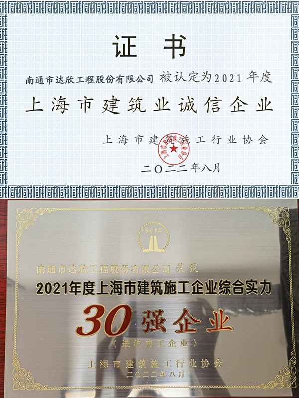 近日,上海市建筑施工行業(yè)協(xié)會(huì)公布了2021年度“上海市建筑業(yè)誠(chéng)信企業(yè)”和“上海市建筑施工企業(yè)綜合實(shí)力”認(rèn)定結(jié)果。第一工程公司連續(xù)14年獲得“上海市建筑業(yè)誠(chéng)信企業(yè)”和“上海市建筑施工企業(yè)綜合實(shí)力”稱號(hào)。