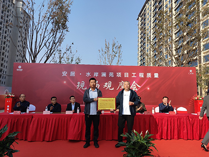 10月19日,第三工程公司承建的安居?水岸瀾苑項(xiàng)目工程質(zhì)量現(xiàn)場觀摩會暨廣平縣2023年度建設(shè)質(zhì)量樣板工程頒獎儀式隆重舉行。邯鄲市建筑工程質(zhì)量管理站副站長徐金峰、張少軍科長、廣平縣建筑工程質(zhì)量監(jiān)督站,廣平縣在建工程各施工單、監(jiān)理單位、地產(chǎn)開發(fā)商代表等120余人參加活動。安居?水岸瀾苑項(xiàng)目經(jīng)理吉光代表公司接受“2023年度建設(shè)質(zhì)量樣板工程”獎牌。