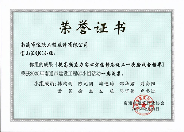 2月24日,南通市建筑行業(yè)協(xié)會(huì)發(fā)布2025年南通市工程建設(shè)質(zhì)量管理小組(QC 小組)活動(dòng)評價(jià)結(jié)果,公司寶山區(qū)大場鎮(zhèn) W12-1301 單元 32-04 地塊項(xiàng)目寶山匯 QC 小組選送的《提高預(yù)應(yīng)力實(shí)心方樁靜壓施工一次驗(yàn)收合格率》成果,榮獲一類成果。