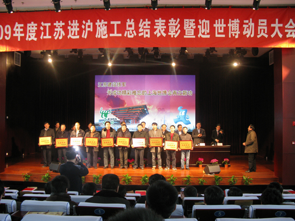 三月十日,江蘇省人民政府駐滬辦、江蘇省建筑工程管理局在上海隆重召開了2009年進滬施工總結表 彰大會,出席大會的有江蘇省建設廳副廳長、省建管局局長徐學軍、上海市建交委沈主任、建管辦曾主任 、上海市施工行業(yè)協(xié)會高秘書長、省人民政府駐滬辦陳主任、王處長等領導,會上對進滬施工先進企業(yè)、 先進個人進行了頒獎,我公司作為先進企業(yè)的代表上臺領獎,這是公司連續(xù)三年獲此榮譽。近幾年達欣公 司在強手如林的上海市場占得了一席之地,同時公司在上海開拓性的發(fā)展也得到了江蘇省、上海市建設主 管部門的充分肯定。